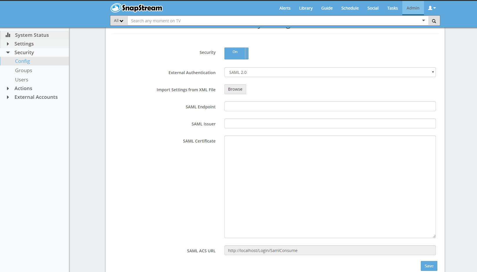 To configure your SnapStream to use DUO SSO you will need to head to the Admin tab select the Security drop-down menu and click on Config. For External Authentication select SAML 2.0. Keep note of the SAML ACS URL as you will need it when in the DUO Application.