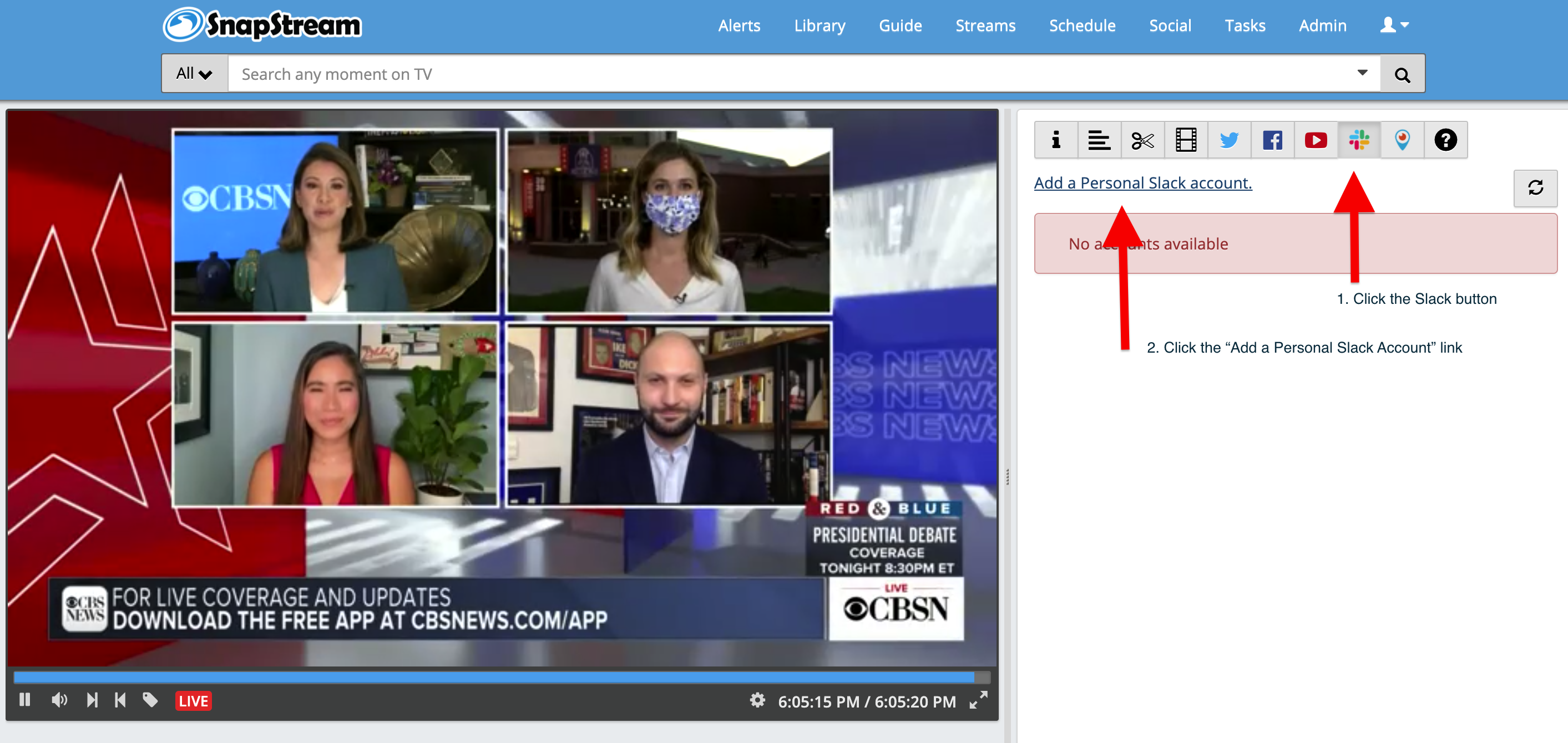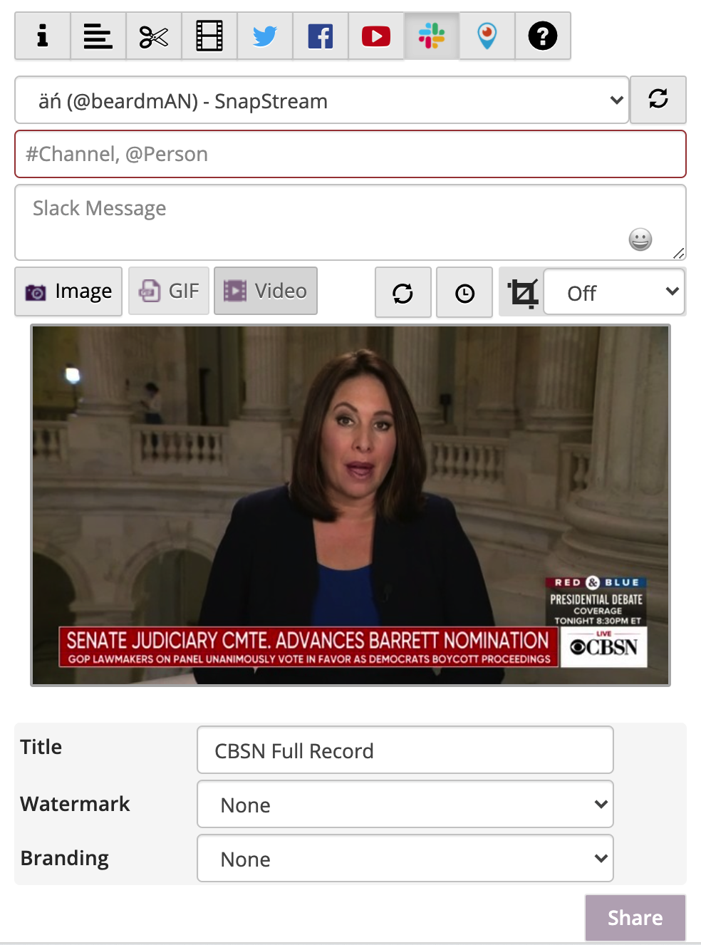 - Once the Slack account has been added to SnapStream, you'll be able to share video screenshots and clips to Slack.