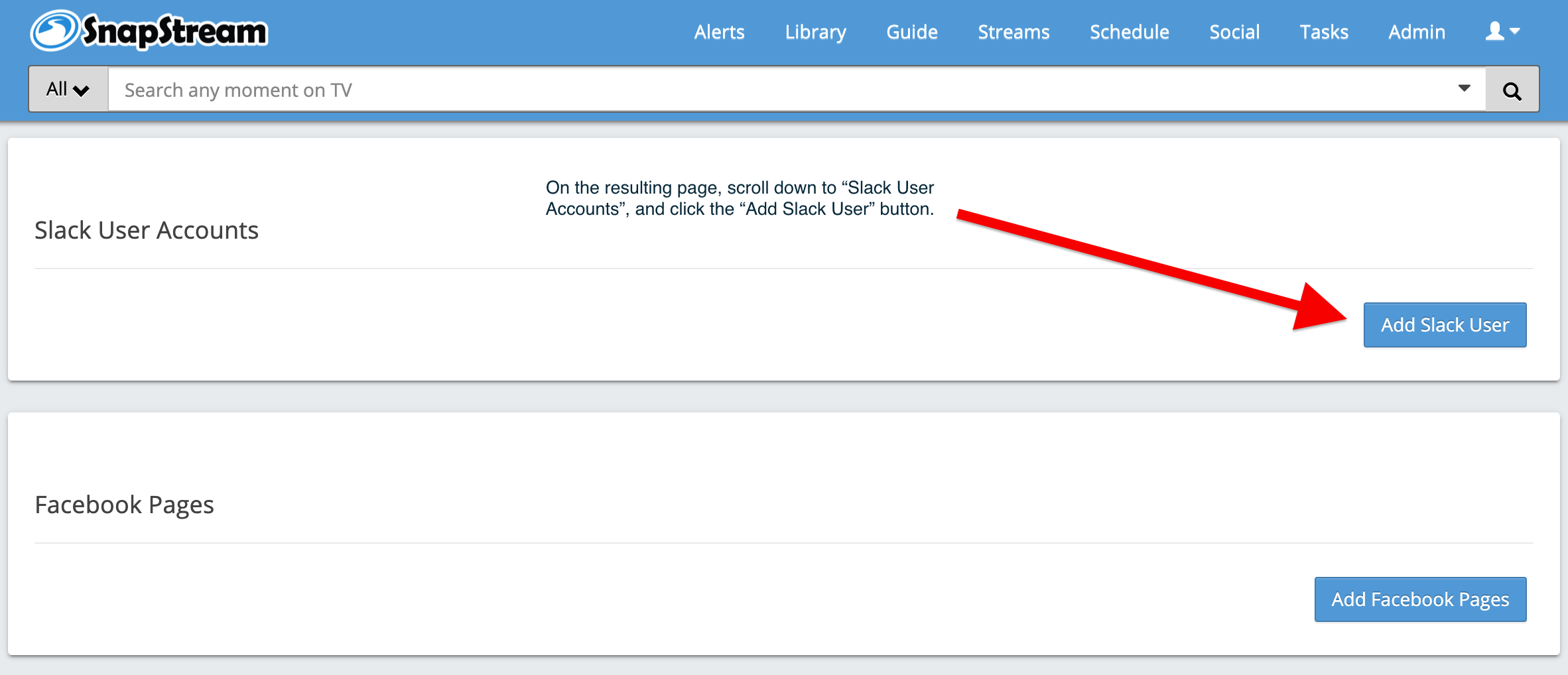 - On the resulting page, scroll down to "Slack User Accounts" and click the "Add Slack User' button.