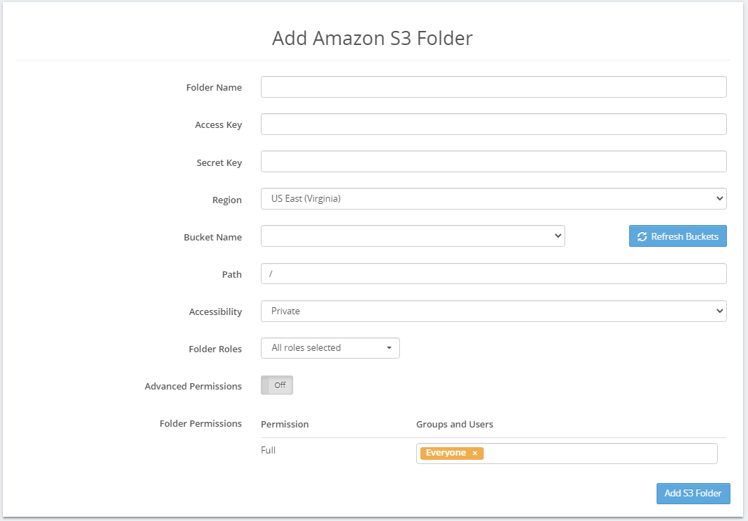 A: To get started, navigate to Admin=> Settings=> Folders and click on the Amazon logo in the Folders section.